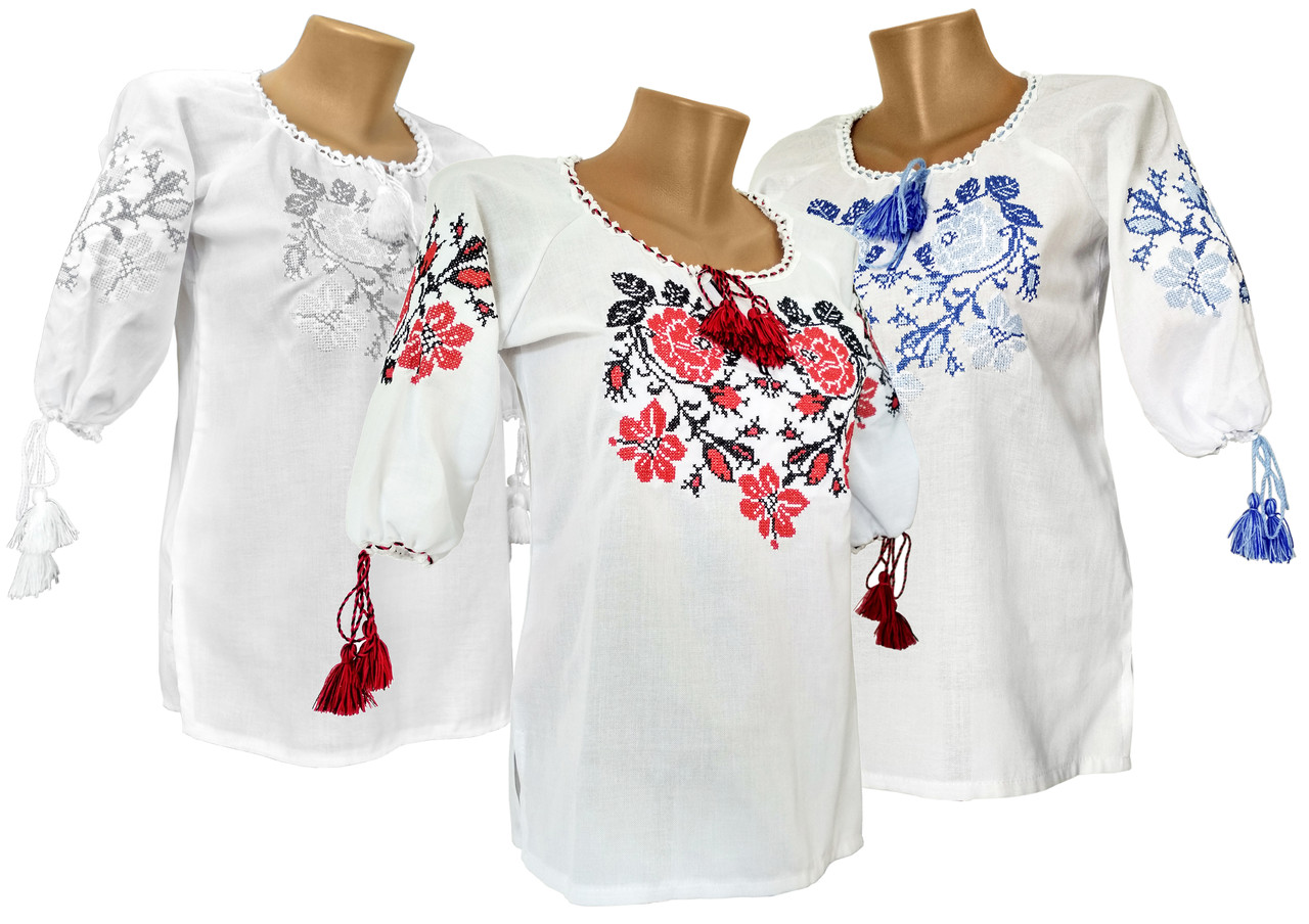 Ніжна українська вишиванка виглядає яскраво і нарядно, завдяки насиченому орнаменту, виконаному хрестиком на якісному полотні, під фігурною горловиною і по рукавах вільного крою довжиною 3/4. Дана модель приталеного силуету підійде до офісного ансамблю одягу або може стати елементом національного костюма. Купуючи вишитий одяг у нас, Ви стаєте модною, сучасною і патріотичною.